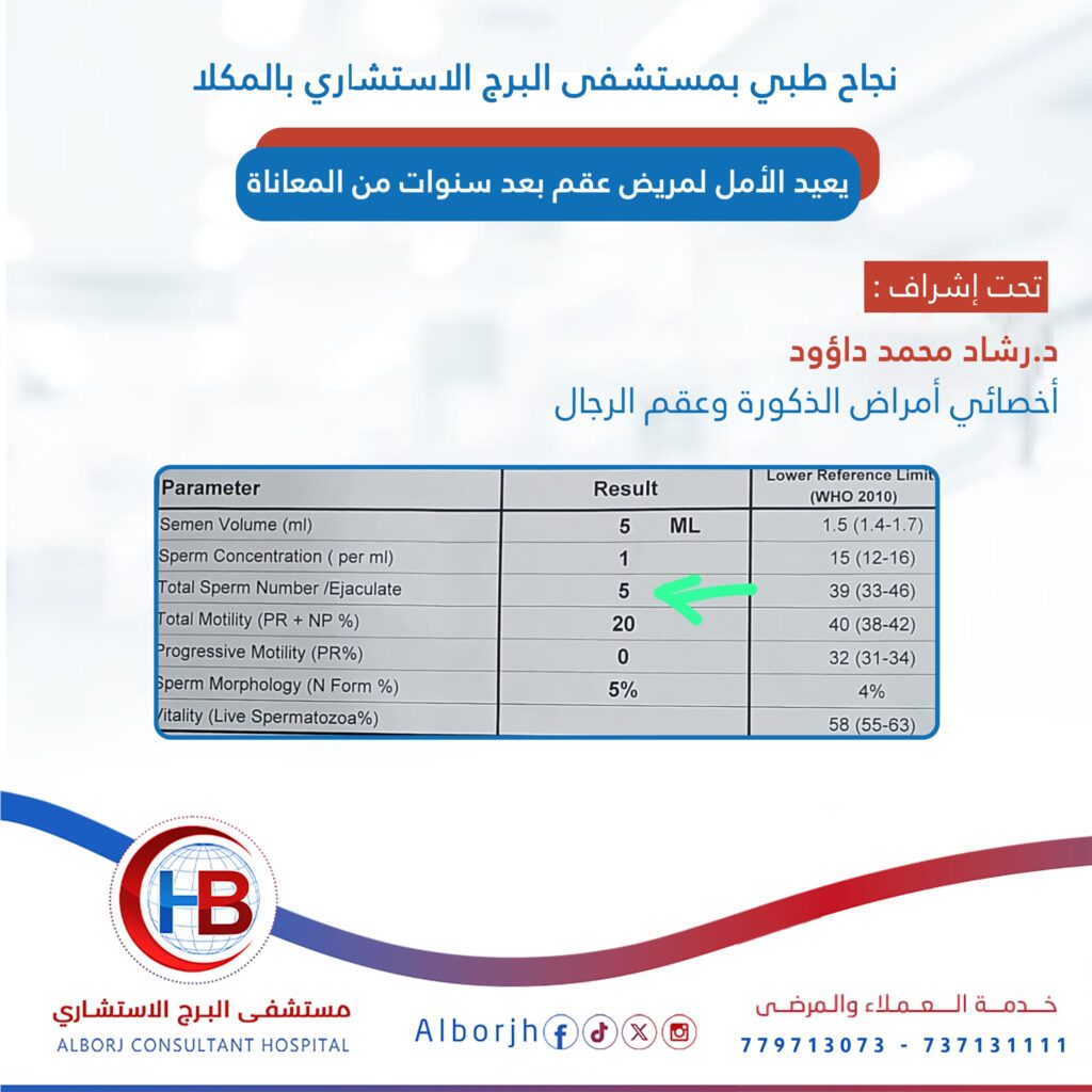 نجح الدكتور رشاد محمد داؤود أخصائي أمراض الذكورة وعقم الرجال بـمستشفى البرج الاستشاري المكلافي تحقيق تطور طبي إيجابي لحالة عقم ذكري معقدة استمرت لسنوات.